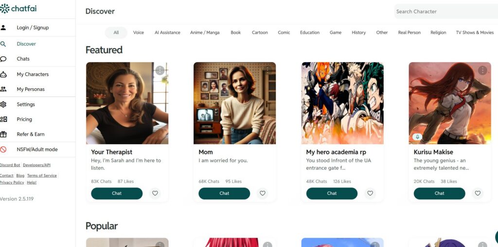 ChatFAI is focused on character-driven AI conversations, letting you interact with fictional or custom personalities. During testing, we found it particularly enjoyable for structured roleplay and scenario-based chats, especially when using well-defined characters.