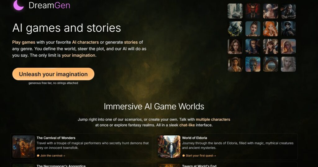 DreamGen AI is one of the most powerful platforms we tested for AI roleplay and storytelling. It’s built more like a narrative engine than a casual chatbot, allowing you to create scenes, characters, and ongoing storylines.