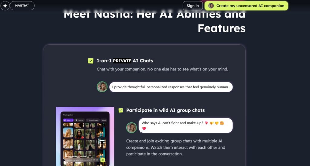 From our testing, Nastia AI focuses heavily on emotional and expressive conversation, making it feel more natural compared to more scripted chatbots. The AI adapts well to tone and mood, which makes interactions feel smoother and less robotic.